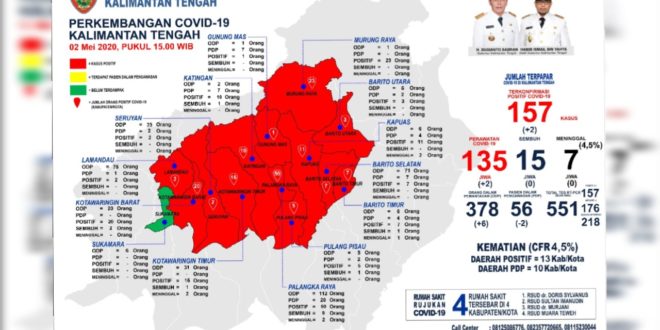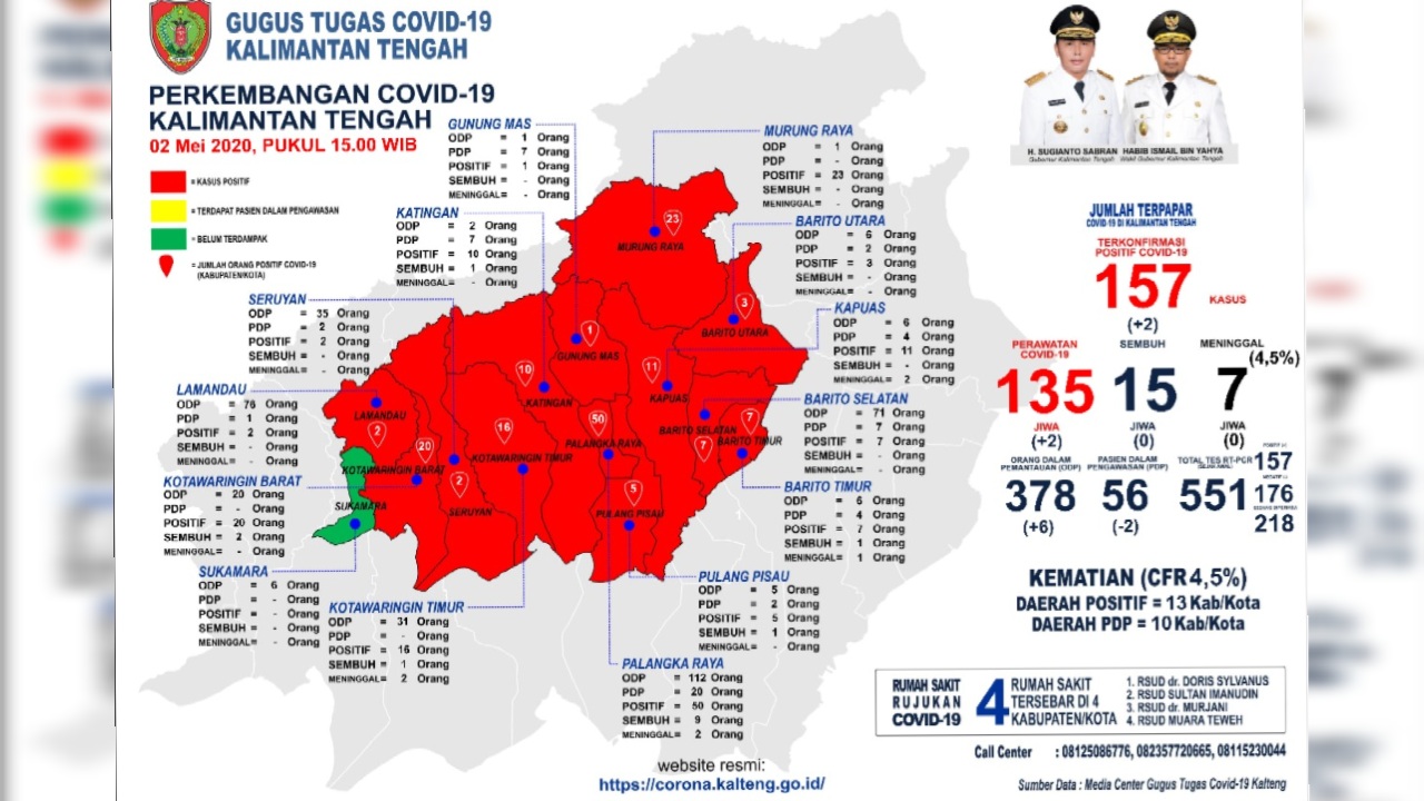 Gubernur Kalimantan Tengah (Kalteng) bapak H Sugianto Sabran menyampaikan informasi perkembangan penanganan COVID-19 di wilayah Kalteng per hari Sabtu (2/5/2020) sekira pukul 15.00 WIB.