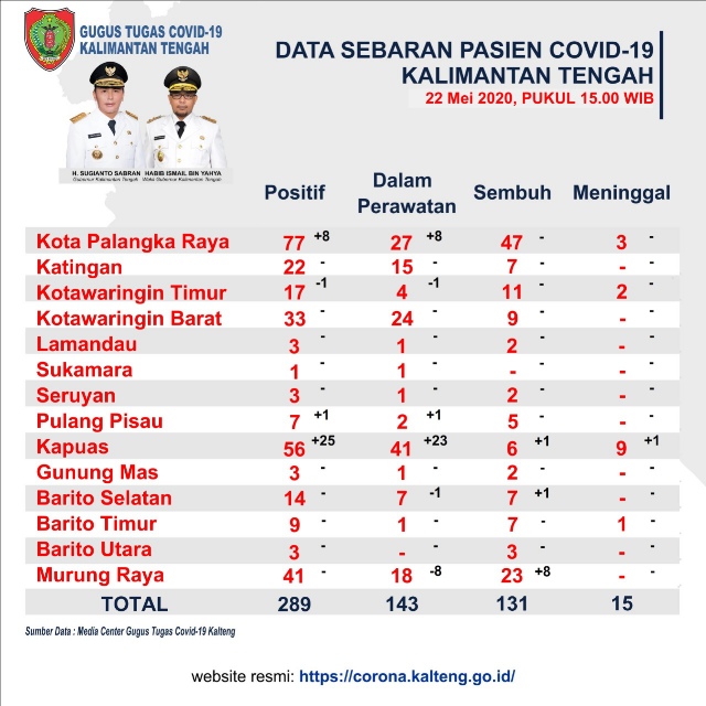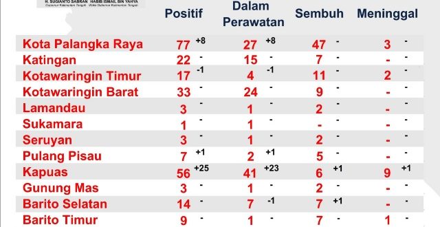 “Satu orang (sembuh), yang dirawat di RSUD Doris Sylvanus Palangka Raya, (riwayat penularan) pasien yang kerja di perusahaan di Puruk Cahu, Murung Raya,” tulis Djul.