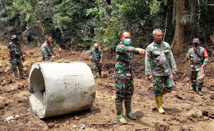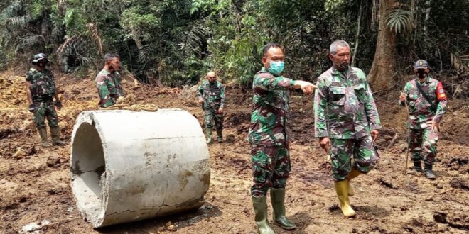 Beritakalteng.com, TAMIANG LAYANG – Babinsa Koramil 1012/06 Ampah Serka Karyanto, mejadi pelopor para personil Satgas TMMD Reguler Ke-109 Kodim 1012 Buntok, untuk memasang gorong-gorong di sasaran utama pembangunan jalan penghubung antara Desa Sibung dan Dusun Layung Habang, Kecamatan Raren Batuah, Kabupaten Barito Timur, Jumat (2/10/2020).