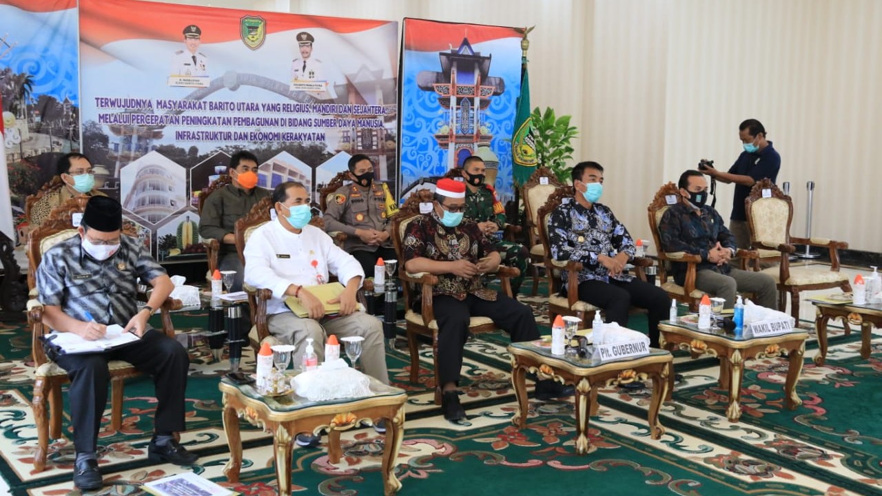 FOTO : Plt. Gubernur Kalimantan Tengah, Habib Ismail bin Yahya bersama Wakil Bupati Barito Utara, Sugianto Panala Putra beserta jajaran ketika mengikuti Rakor Anev secara virtual.