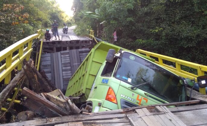Terperosok : Diduga karena kondisi konstruksinya yang lapuk, dump truk bermuatan material batu dan besi terperosok di jembatan di Jalan Barito Raya, Kota Buntok, Selasa (29/9/2020) malam.