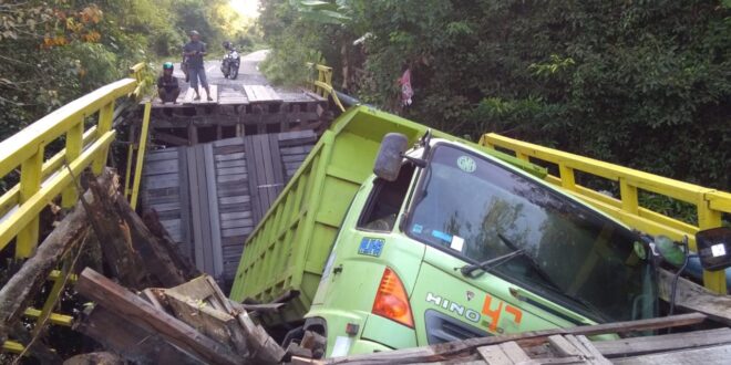 Terperosok : Diduga karena kondisi konstruksinya yang lapuk, dump truk bermuatan material batu dan besi terperosok di jembatan di Jalan Barito Raya, Kota Buntok, Selasa (29/9/2020) malam.