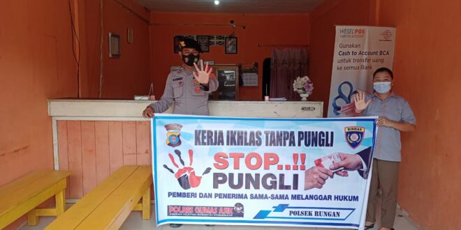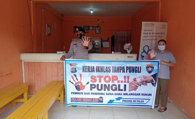 beritakalteng.com – Kuala Kurun – Polsek Rungan, Polres Gunung Mas melaksanakan Sosialisasi Saber Pungli Sebagaimana dimaksud dalam Perpres Nomor 87 Tahun 2016 kepada masyarakat di Desa Bunut, Kec. Rungan, Kab. Gumas Prov. Kalteng. Rabu (27/1/2021) pagi.