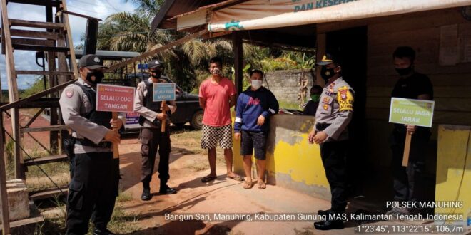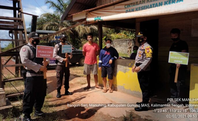 beritakalteng.com – KUALA KURUN – Menggunakan media papan portable, Polsek Manuhing, Polres Gunung Mas memberikan imbauan atau pesan kepada masyarakat untuk menerapkan protokol kesehatan (prokes) cegah penyebaran covid-19.