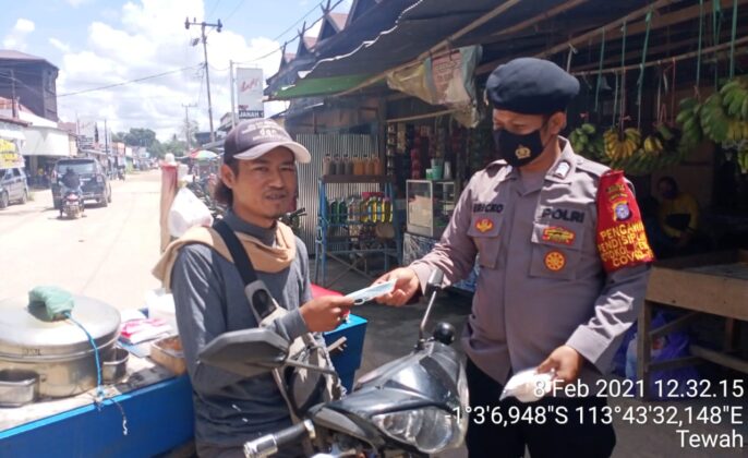 beritakalteng.com – KUALA KURUN – Polsek Tewah jajaran Polres Gunung Mas melaksanakan kegiatan operasi yustisi penertiban penggunaan masker serta pemberian masker gratis.