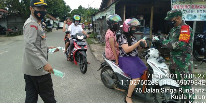 beritakalteng.com – KUALA KURUN – Jajaran Polsek Kurun, Polres Gunung Mas (Gumas, Polda Kalteng membagikan masker gratis kepada masyarakat pengendara jalanan umum yang melintas di simpang tiga kantor Kesbangpol Kab. Gumas, Kalteng, Minggu (7/2/2021) pukul 11.00 Wib.