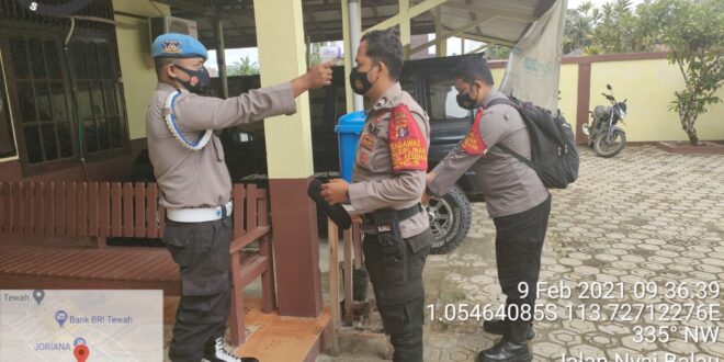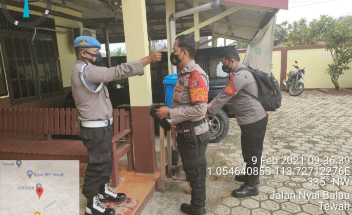 beritakalteng.com – KUALA KURUN – Upaya pencegahan penanganan virus Covid-19 terus dilakukan oleh Polsek Tewah, jajaran Polres Gunung Mas (Gumas), Polda Kalteng dengan memberikan edukasi kepada warga untuk selalu mencuci tangan dan wajib memakai masker yang akan memasuki Mako Polsek Tewah, Selasa (09/02/2021) pagi.