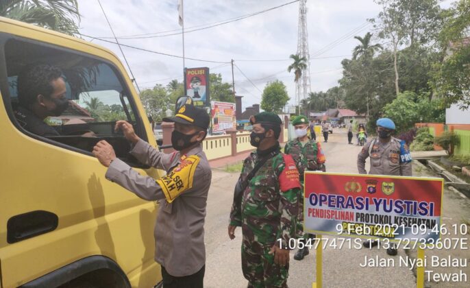 beritakalteng.com – KUALA KURUN – Jajaran Polsek Tewah, Polres Gunung Mas (Gumas), Polda Kalteng bersinergi bersama Koramil Tewah melaksanakan Operasi Yustisi pendisiplinan protokol kesehatan terhadap masyarakat yang sedang beraktivitas diluar rumah. Selasa (9/2/2021) pukul 10.00 WIB.