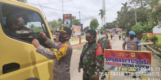 beritakalteng.com – KUALA KURUN – Jajaran Polsek Tewah, Polres Gunung Mas (Gumas), Polda Kalteng bersinergi bersama Koramil Tewah melaksanakan Operasi Yustisi pendisiplinan protokol kesehatan terhadap masyarakat yang sedang beraktivitas diluar rumah. Selasa (9/2/2021) pukul 10.00 WIB.