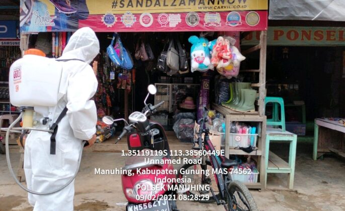 beritakalteng.com – KUALA KURUN – Polsek Manuhing, Polres Gunung Mas (Gumas), Polda Kalteng melakukan penyemprotan disinfektan di sejumlah fasilitas umum di wilayahnya dalam mengantisipasi penyebaran Covid-19, Selasa (09/02/2021) pagi.