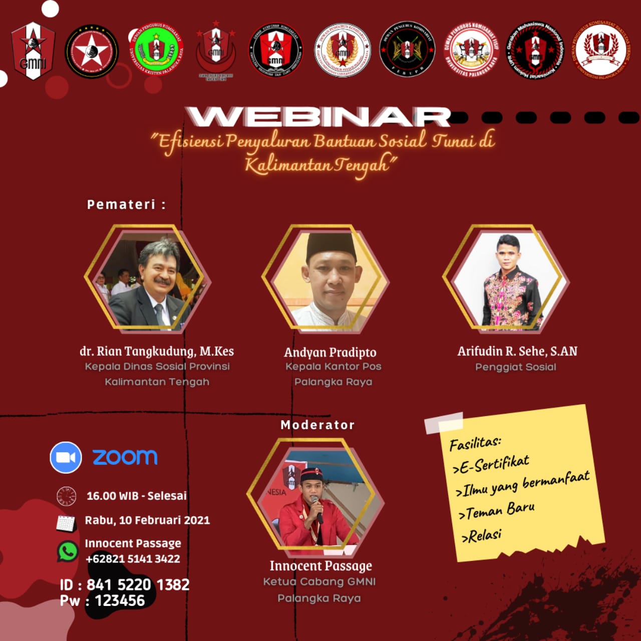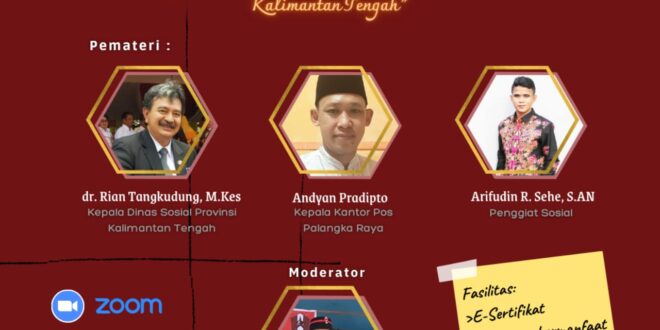 Kegiatan tersebut menghadirkan sejumlah narasumber diantaranya, Plt. Kepala Dinas Sosial Provinsi Kalteng, dr. Rian Tangkudung, M.Kes, Kepala Kantor Pos Palangka Raya, Andyan Pradipto, Penggiat Sosial, Arifudin R. Sehe, S.AN, dan Ketua Cabang GMNI Palangka Raya, Innocent Passage selaku Moderator, serta sejumlah undangan lainya.