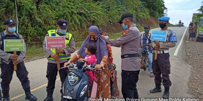 beritakalteng.com – KUALA KURUN – Polsek Manuhing, Polres Gunung Mas (Gumas), Polda Kalteng, terus menggiatkan sosialisasi pencegahan Covid-19 dengan menerapkan Protokol Kesehatan (Prokes) bagi masyarakat di wilayah hukumnya, Rabu (10/2/2021) siang.