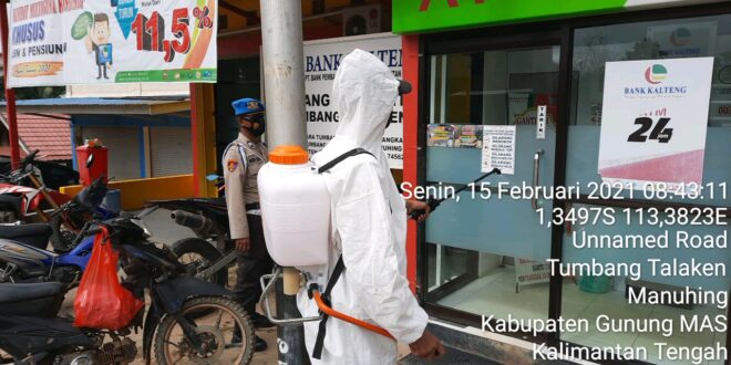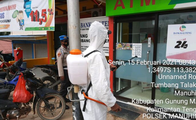 beritakalteng.com – KUALA KURUN – Personel Polsek Manuhing jajaran Polres Gunung Mas melakukan penyemprotan disinfektan untuk mencegah adanya peneyebaran Covid-19, Senin (15/2/2021) pagi.