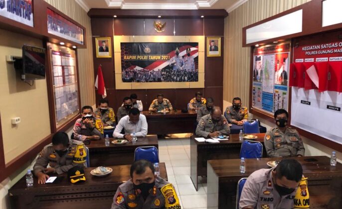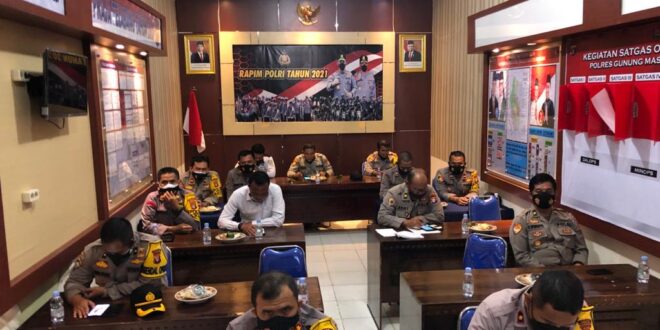 beritakalteng.com – KUALA KURUN – Kapolres Gunung Mas, Polda Kalteng AKBP Rudi Asriman, S.I.K., bersama seluruh Pejabat Utama Polres mengikuti Rapim TNI-Polri di Rupatama Polres, Selasa (16/2/2021) pagi.