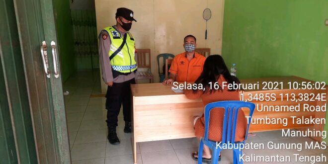 beritakalteng.com – KUALA KURUN – Personel Polsek Manuhing, Polres Gunung Mas, Bripka Halin Sudarmadi melaksanakan pengamanan Kegiatan Penyaluran Bantuan Sosial Tunai (BST) dari Kemensos melalui Kantor Pos Kec. Manuhing, Kab. Gumas, Selasa (16/2/2021) Siang.
