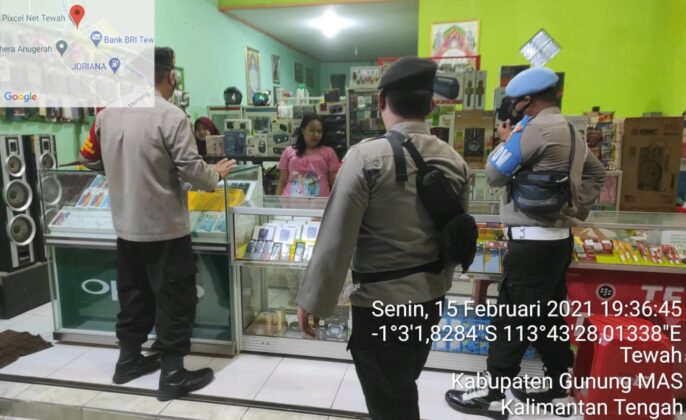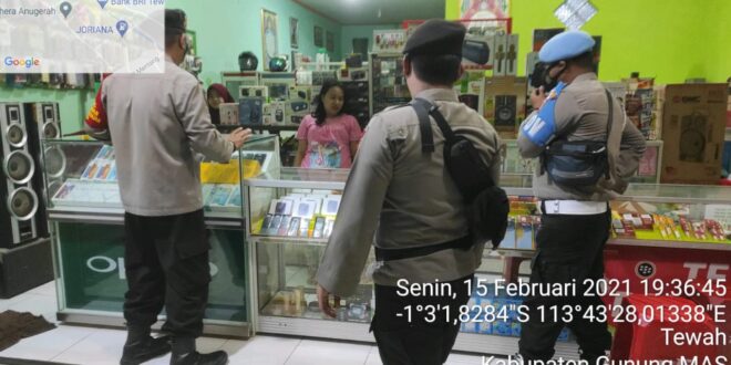 beritakalteng.com – KUALA KURUN – Personil Polsek Tewah, Polres Gunung Mas (Gumas) Polda Kalteng, melaksanakan kegiatan patroli pada malam hari demi menjaga situasi yang aman dan kondusif di Kecamatan Kurun, Kabupaten Gunung Mas, Senin (15/2/2021) Malam.