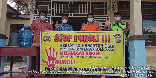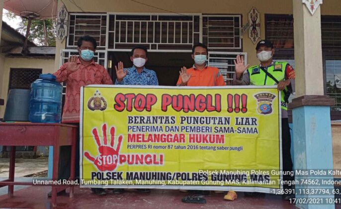 beritakalteng.com – KUALA KURUN – Personel Polsek Manuhing, Polres Gunung Mas mensosialisasikan Peraturan Presiden nomor 87 tahun 2016 tentang Satuan Tugas Sapu Bersih Pungutan Liar atau Satgas Saber Pungli dengan sasaran Perkantoran yang ada di wilayah Kec. Manuhing, Kab. Gumas, Prov. Kalteng, Rabu (17/2/2021) siang.
