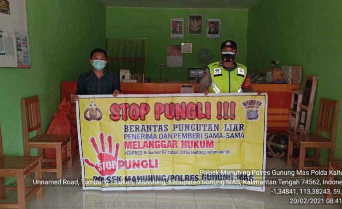 beritakalteng.com – KUALA KURUN – Personel Polsek Manuhing, Polres Gunung Mas jajaran Polda Kalteng, mensosialisasikan Peraturan Presiden nomor 87 tahun 2016 tentang Satuan Tugas Sapu Bersih Pungutan Liar atau Satgas Saber Pungli di wilayah hukumnya, Sabtu (20/2/2021) siang.