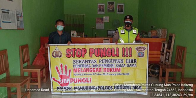 beritakalteng.com – KUALA KURUN – Personel Polsek Manuhing, Polres Gunung Mas jajaran Polda Kalteng, mensosialisasikan Peraturan Presiden nomor 87 tahun 2016 tentang Satuan Tugas Sapu Bersih Pungutan Liar atau Satgas Saber Pungli di wilayah hukumnya, Sabtu (20/2/2021) siang.