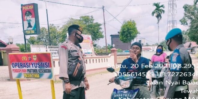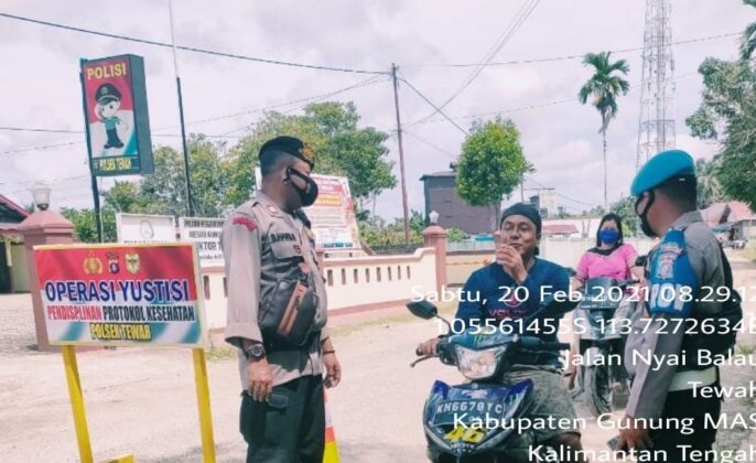 beritakalteng.com – KUALA KURUN – Mengantisipasi penyebaran Covid-19, Personel Polsek Tewah, Polres Gunung Mas melaksanakan operasi Yustisi Protokol Kesehatan di wilayah hukumnya, Sabtu (20/2/2021) siang.