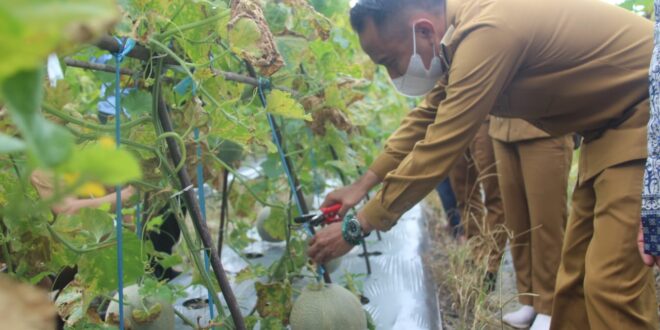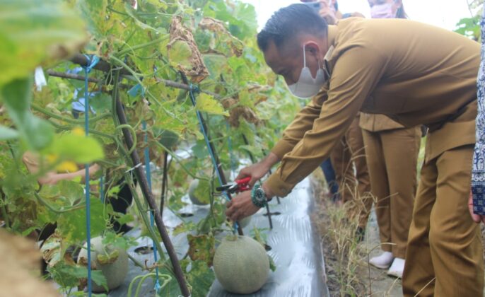 FOTO : Walikota Palangka Raya, Fairid Naparin saat panen buah melon.