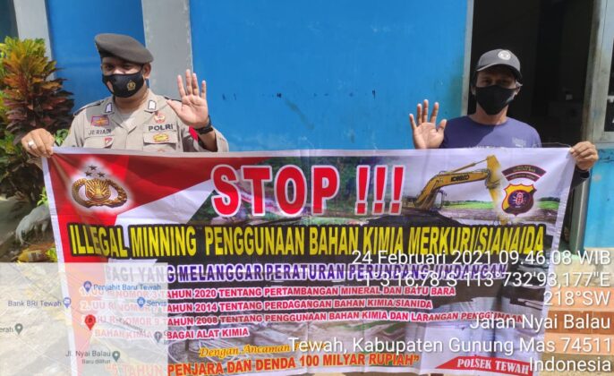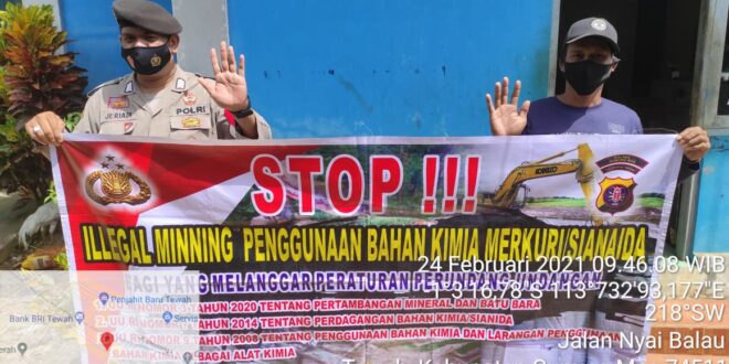 beritakalteng.com – KUALA KURUN – Bhabinkamtibmas Polsek Tewah Polres Gunung Mas Bripka Jeriadi melaksanakan sosialisasi menggunakan spanduk yang berbunyi Stop Penambangan Liar Dan Penggunaan Bahan Kimia Merkuri / Sianida, di desa binaanya, Rabu (24/2/2021) pukul 10.00 WIB.