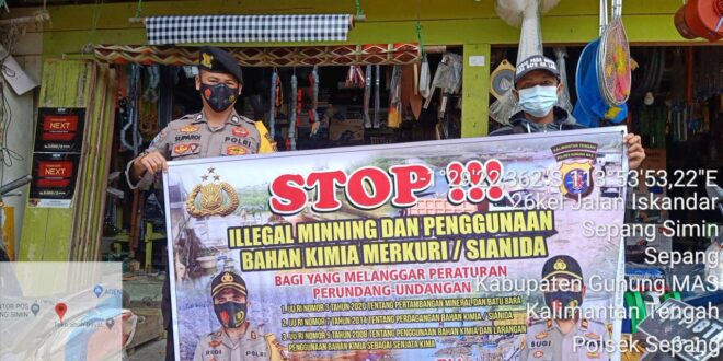 beritakalteng.com – KUALA KURUN – Anggota Polsek Sepang, Polres Gunung Mas (Gumas) jajaran Polda Kalteng melaksanakan sosialisasi menggunakan sepanduk yang berbunyi Setop Penambangan Liar Dan Penggunaan Bahan Kimia Merkuri / Sianida, di Kec. Sepang, Kamis (25/2/2021) siang.