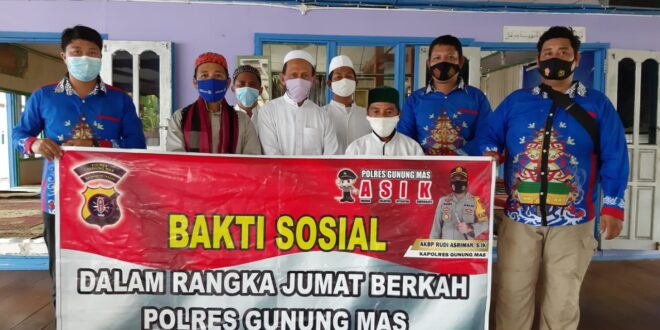 Seperti yang dilakukan Kapolres Gunung Mas, Polda Kalteng AKBP Rudi Asriman, S.I.K., melalui Kasatresnarkoba Ipda Budi Utomo, S.H., dengan anggotanya menggelar Baksos di Masjid Nurul Yakin Kelurahan Kuala Kurun yang berada di Jalan Sangkurun, Jumat (26/2/2021) siang.