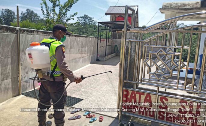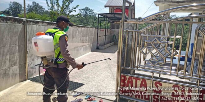 beritakalteng.com – KUALA KURUN – Penyemprotan desinfektan untuk mencegah penyebaran virus Covid-19 dilaksanakan oleh personel Polsek Manuhing jajaran Polres Gunung Mas (Gumas) Polda Kalteng di tempat ibadah, kegiatan penyemprotan dilaksanakan di Masjid-mesjid, Jumat (26/2/2021) pagi.