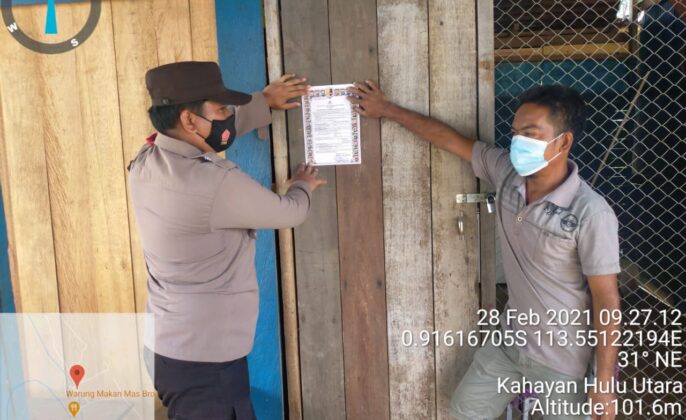 beritakalteng.com – KUALA KURUN – Personel Polsek Kahut jajaran Polres Gunung Mas (Gumas), Polda Kalteng, Bripka M. Rizai, lakukan patroli dan himbau warganya yang kesehariannya bekerja di lahan agar sama – sama menjaga hutan dan lahan dari kebakaran, Minggu (28/2/2021) Siang.