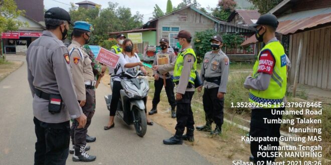 beritakalteng.com – KUALA KURUN – Jajaran Polsek Manuhing, Polres Gunung Mas (Gumas) Polda Kalteng turut ambil andil dalam menggalakan Pemberlakukan Pembatasan Kegiatan Masyarakat (PPKM) skala mikro di desa binaan sesuai dengan arahan Presiden Joko Widodo agar penanganan Covid-19 menggunakan pendekatan level mikro. Selasa (2/3/2021) Pagi.