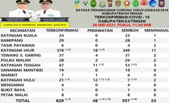 Kasongan – Sebanyak 3 warga Kabupaten Katingan dilaporkan terkonfirmasi positif Covid-19 dan 4 warga lainnya sembuh, Rabu, (26/5/2021) hari ini.