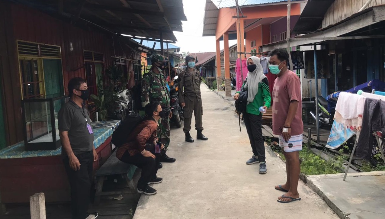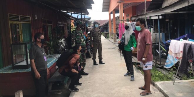 FOTO : Serda Sunardi Babinsa Koramil 1016-01/Pahandut bersama unsur terkait lainnya melakukan tracing serta edukasi Prokes kepada warga di sekitar jalan kerinci dan simpei karuhei 5, kelurahan palangka, kecamatan jekan raya, minggu (01/8/21).