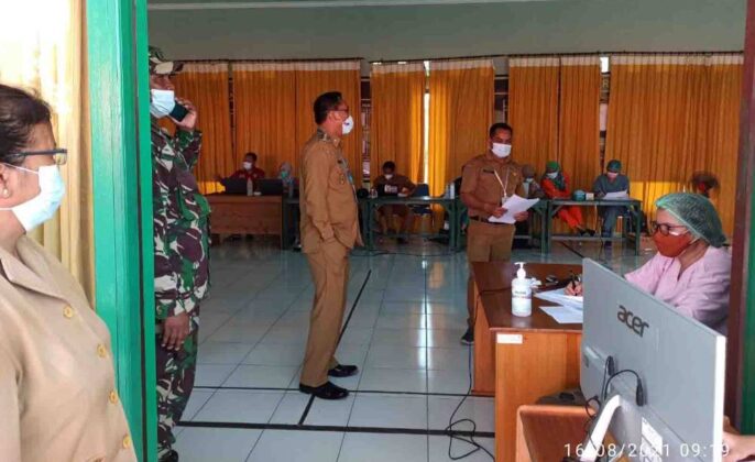 Kasongan – Wakil Bupati Katingan Sunardi Litang meninjau pelaksanaan vaksinasi Covid-19 di Kantor Perwira Penghubung atau Pabung 1015 Kodim Sampit di Kasongan, Senin, (16/8/2021).