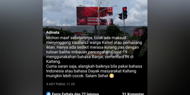 Dalam keterangan fotonya, Adinata menuliskan bahwa ‘Mohon maaf sebelumnya, tidak ada maksud menyinggung saudara2 warga Kalsel atau pemasang iklan. Hanya ada sedikit merasa kurang pas dengan tulisan baliho imbauan pencegahan Covid-19 menggunakan bahasa Banjar, sementara ini di Kalteng’.