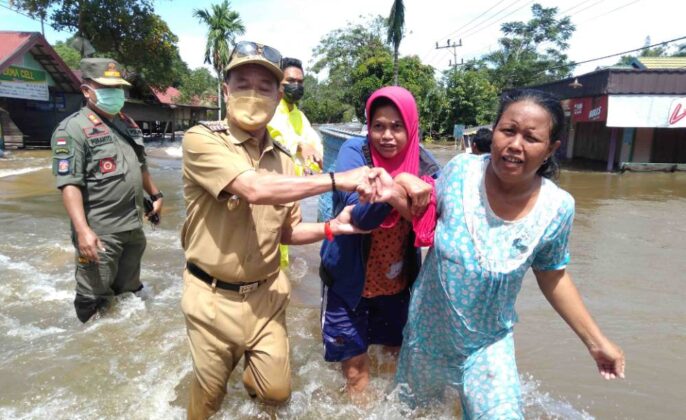 Kasongan – Bupati Katingan Sakariyas turut mengevakuasi warga yang terjebak banjir di Jalan Trans Kalimantan Km 1 Kasongan – Kereng Pangi, Selasa, (7/9/2021).
