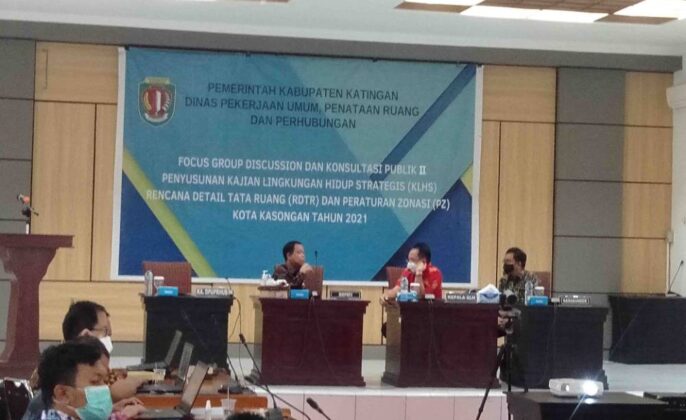 Kasongan – Bupati Katingan Sakariyas bersama pihak dinas terkait seperti Kepala Dinas Pekerjaan Umum, Christian Rain, Kepala Dinas Lingkungan Hidup atau DLH Hap Bapperdo dan lainnnya menghadiri focus group discussion dan konsultasi publim II penyusunan kajian lingkungan hidup strategis atau KLHS rencana detail tata ruang atau RDTR dan peraturan zonasi Kota Kasongan di Aula Bappelitbang, Kamis, (18/11 2021)
