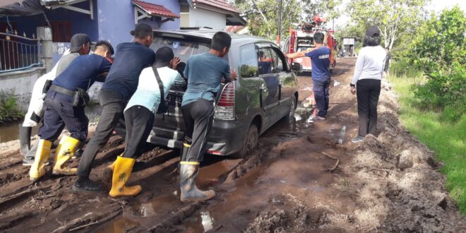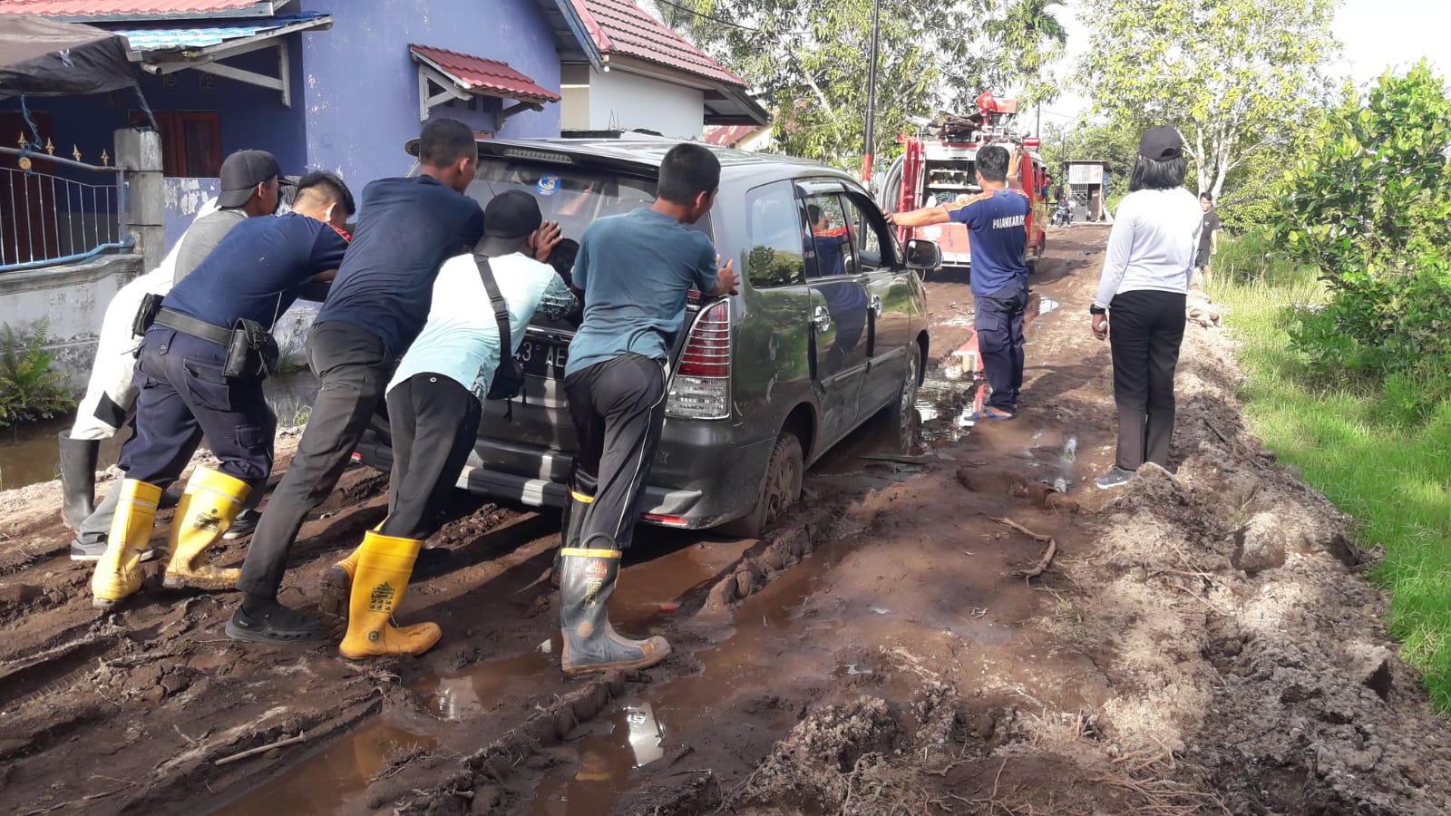 FOTO : Tim Rescue LCEC 112 DPKP Kota ketika mengevakuasi salah satu mobil milik warga yang terjebak dijalan berlumpur, minggu (05/12/2021)