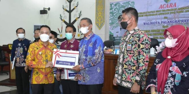 FOTO : Wali Kota Palangka Raya, Fairid Naparin saat menerima DIPA dan DPA di aula Peteng Karuhei II Kantor Wali Kota Palangka Raya, Jumat (14/1/2021).