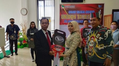BERITAKALTENG.com – KASONGAN – Bupati Katingan Sakariyas didampingi Pimpinan Bank Cabang Kasongan Empas S Umar, secara simbolis menyerahkan hadiah utama duah buah mobil Daihatsu Rocky kepada dua orang warga Katingan atau nasabah hasil dari undian program Tabungan Hari Esok Terencana (Taheta) ke 25 PT Bank Kalteng tahun 2021, di aula lantai II Bank Kalteng Cabang Kasongan, Kamis 27 Januari 2022.