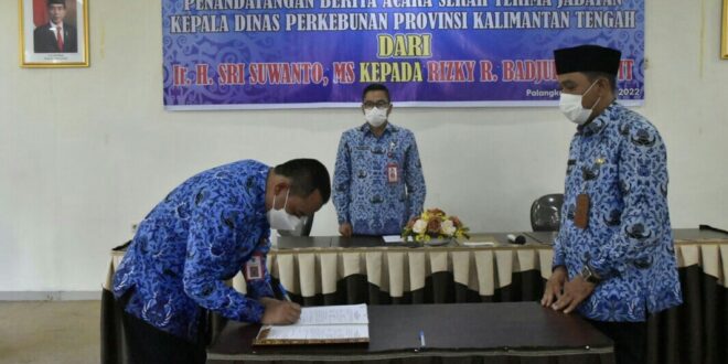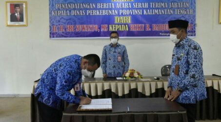 BERITAKALTENG.com – Palangka Raya – Asisten Bidang Perekonomian dan Pembangunan Setda Prov. Kalteng Leonard S. Ampung pimpin sekaligus menjadi saksi pada acara Penandatangan Berita Acara Serah Terima Jabatan Kepala Dinas Perkebunan Prov. Kalteng dari H. Sri Suwanto yang menjabat sebagai Plt. Kepala Dinas Perkebunan Prov. Kalteng sejak 1 Nopember 2020 sampai dengan 13 April 2022 kepada H. Rizky Ramadhana Badjuri sebagai Pelaksana Tugas Pejabat yang baru. Penandatanganan Berita Acara Sertijab berlangsung di Aula Dinas Perkebunan Prov. Kalteng, Senin (18/4/2022).