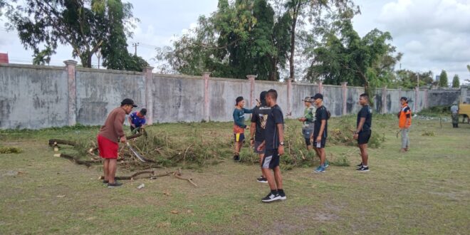 Seperti yang dilakukan oleh sejumlah masyarakat yang tergabung didalam Paguyuban Pangkoh 2B ketika melakukan pembersihan di lingkungan stadion mini UPR yang akan digunakan sebagai tempat acara pembukaan KKN Kebangsaan UPR nanti.