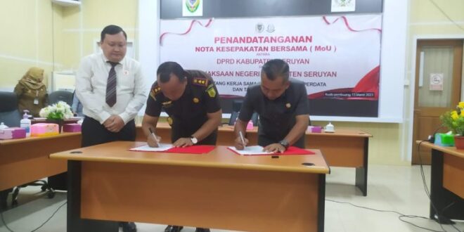 BERITAKALTENG.com – KUALA PEMBUANG – Dewan Perwakilan Rakyat Daerah (DPRD) Kabupaten Seruyan bersama Kejaksaan Negeri (Kejari) Seruyan melaksanakan penandatanganan nota kesepakatan bersama (MoU) tentang kerjasama di Bidang Hukum Perdata dan Tata Usaha Negata atau TUN, di Ruang Rapat Serbaguna DPRD Seruyan, Senin (13/3/2023).