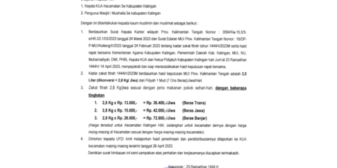 1. Berdasarkan Surat Kepala Kantor wilayah Prov. Kalimantan Tengah Nomor 3594/Kw.15.5/5e/HK.03.1/03/2023 tanggal 24 Maret 2023 dan Surat Edaran MUI Prov. Kalimantan Tengah Nomor : 16/DP-P-MUl/Kalteng/ll/2023 tanggal 24 Februari 2023 tentang kadar zakat fitrah tahun 1444H/2023 M serta hasil rapat bersama Kementerian Agama Kabupaten Katingan, Pemerintah Daerah Kab. Katingan, MUI, NU, Muhamadiyah, DMI, PHBI, Kepala KUA dan Ketua Pokjaluh Kabupaten Katingan hari Jumat 23 Ramadhan 1444 H/ 14 April 2023, menyepakati dan siap mensosialisakan hasil keputusan rapat bersama.