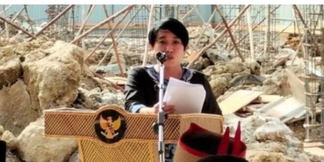 Foto : Kepala Dinas PUPR Barsel Ita Minarni pada acara peletakan batu pertama pembangunan Rumah Betang di Buntok.
