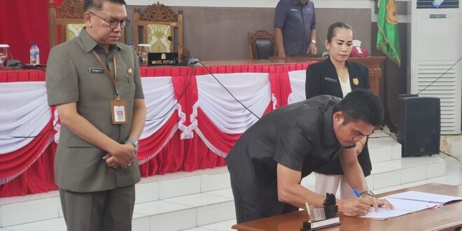 Foto : Ketua DPRD Gunung Mas, Binartha saat menandatangani penetapan AKD.
