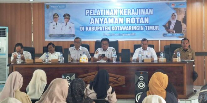 Sampit – Dinas Perdagangan dan Perindustrian Provinsi Kalimantan Tengah bekerja sama dengan Dinas Koperasi, UKM, Perindustrian, dan Perdagangan Kabupaten Kotawaringin Timur menggelar Pelatihan Kerajinan Anyaman Rotan di Aula Dinas Koperasi, UKM, Perindustrian, dan Perdagangan Kabupaten Kotawaringin Timur, Rabu (20/8/2025).