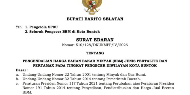 BeritaKalteng.com, BUNTOK – Guna mengendalikan harga jual Bahan Bakar Minyak (BBM) di tingkat pengecer, Pemerintah Daerah Kabupaten Barito Selatan menetapkan Harga Eceran Tertinggi (HET) sebesar Rp13.000 untuk jenis Pertalite dan Rp15.000 untuk jenis Pertamax.